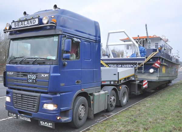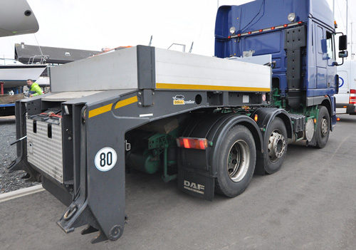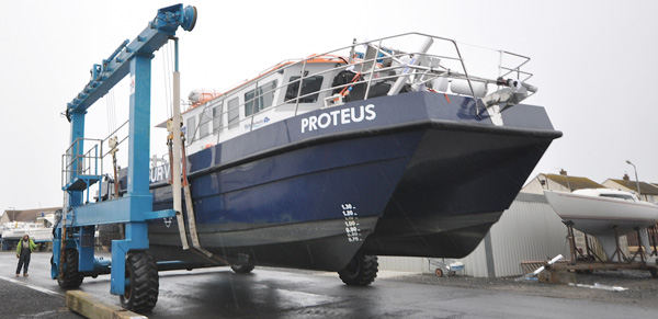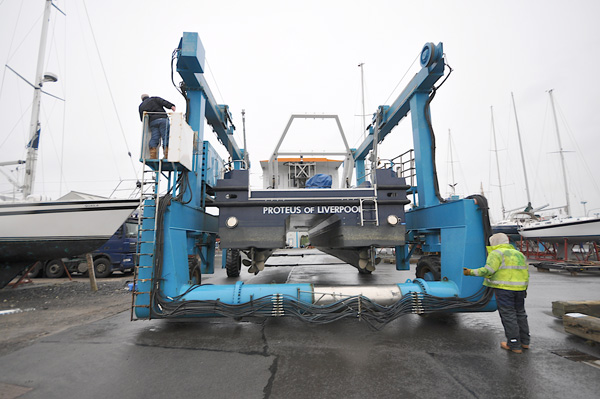 After the 357 mile journey over Shap and Beattock to Troon Yacht Haven on an ultra-low extending trailer, the trailer neck was detached to enable the boatyard's 50 ton travel hoist to straddle the 4.3m overall height of Proteus and lift her catamaran hulls clear of the 19mm high-tensile steel plates that carried her from Grimsby.